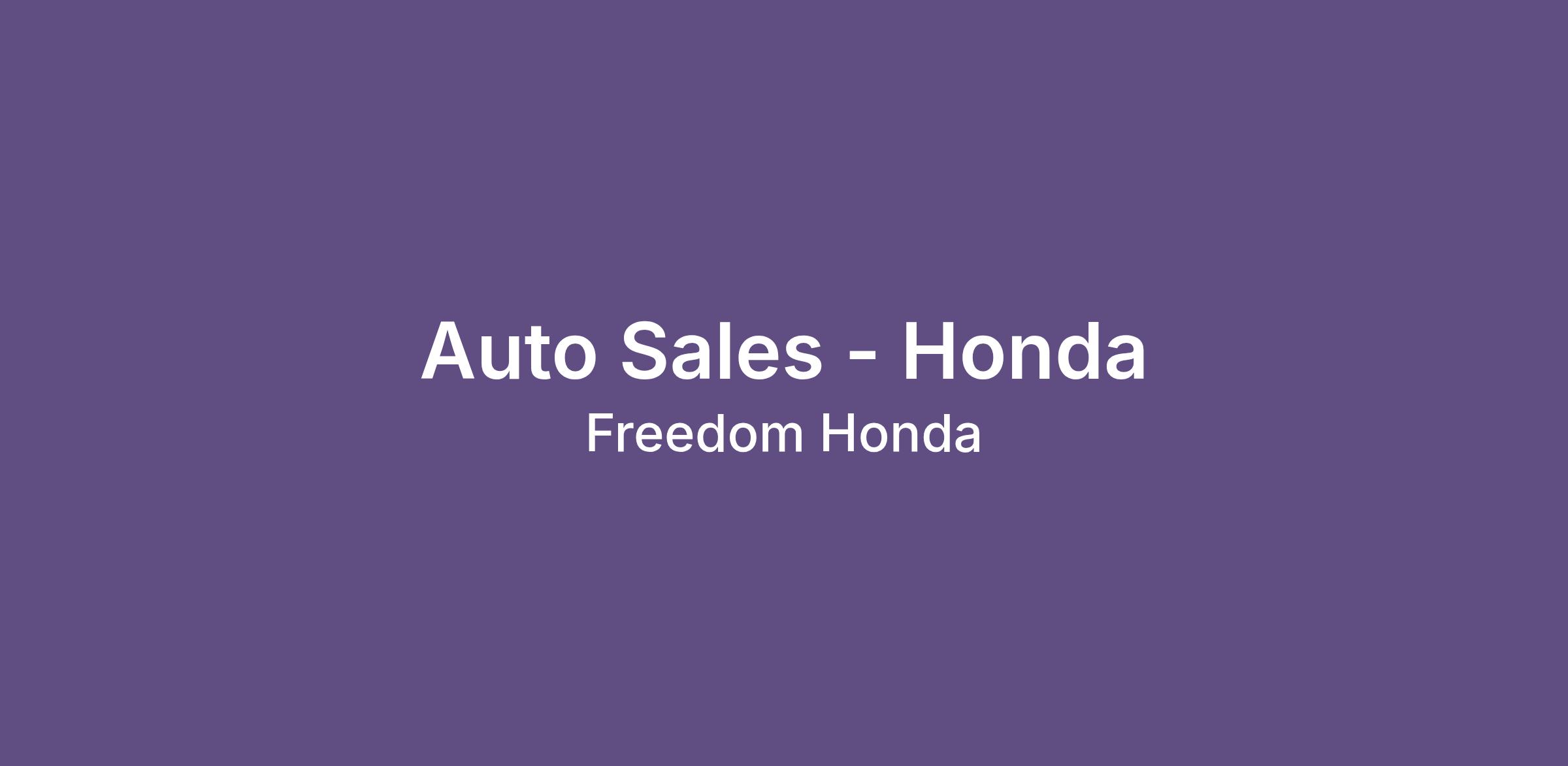 Freedom Honda is a great place to have a rewarding career! We are booming with business and hiring Auto Sales Consultants to help customers select and purchase vehicles. Hondas are top ranked in technology and customer satisfaction and driving experience. You will be successful with excellent training and support from our management team. Your effort equals your financial reward! Earn what you deserve in a lucrative and fun career! Military veterans should apply!