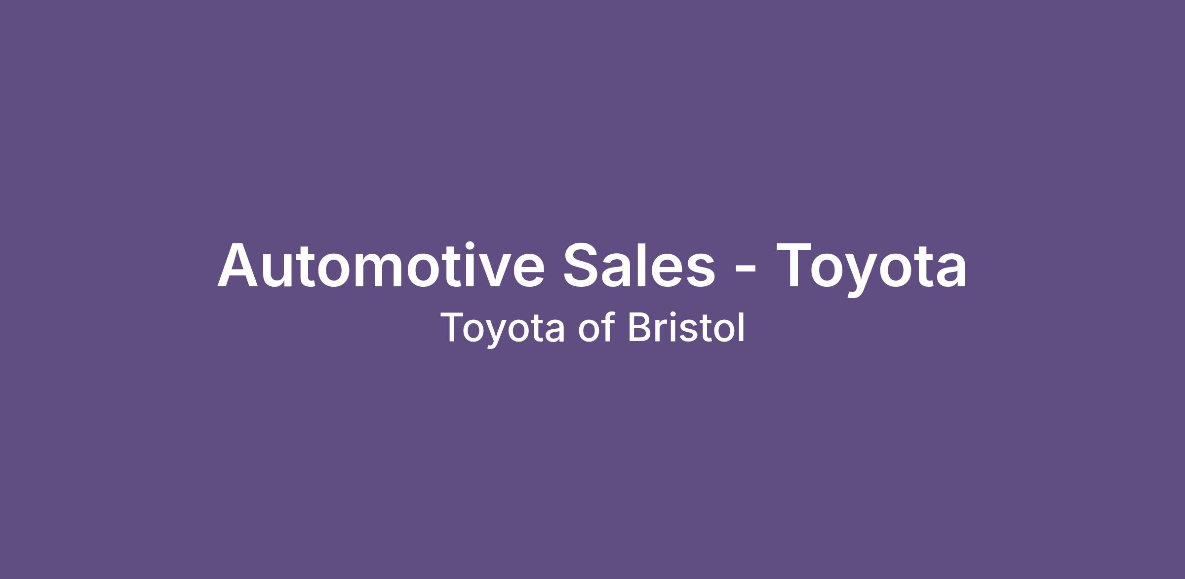 Toyota of Bristol is growing and actively seeking Sales Consultants to meet increased customer demand. If you have a background in retail, marketing, customer service, or real estate, your skill set translates seamlessly to success in automotive sales. Whether you're an experienced auto sales professional or new to the industry, we offer comprehensive training, a supportive team environment, and the resources you need to thrive. We encourage women, men, and veterans to apply. Auto sales experience is recommended but not required.