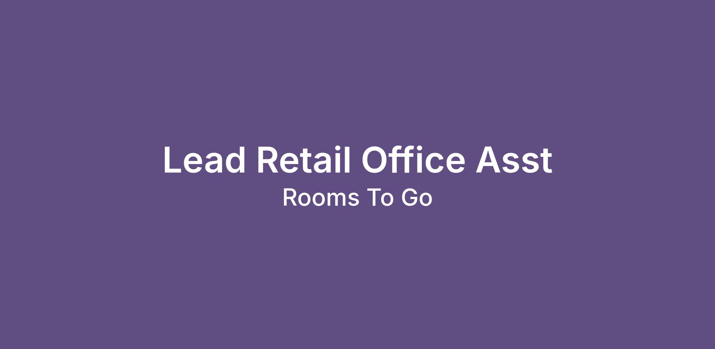 Rooms To GoRetail Office Assistant, LeadStarting Salary: $13 - $15 / hour, depending on experiencePlus medical, dental, vision and other benefits available for associates who want themIndividual Medical Benefits starting at $10 per weekEmployee discounts on Rooms To Go furniture purchasesJoin the ROOMS TO GO TEAM!!!!!