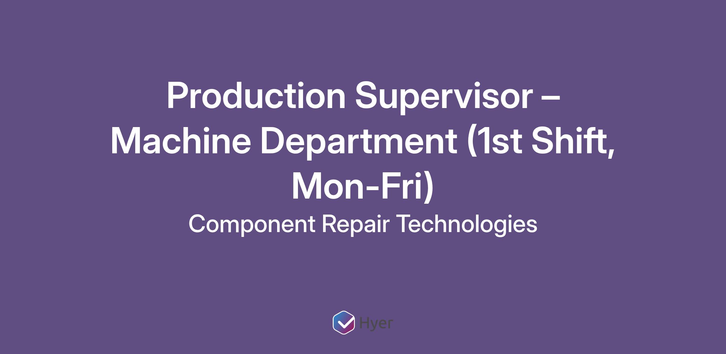 The Machine Department Production Supervisor is responsible for the day-to-day activities of the department which may include manual, CNC and grinding processes. This position will lead their team to meet and exceed our customer goals. The Production Supervisor will ensure that the scheduled work is executed safely and in a systematic manner so that qualified technicians can perform the assigned tasks by ensuring that machines and equipment are maintained, optimized and operated efficiently. This position will monitor the completion of work while ensuring the quality standards are being met. The Production Supervisor will apply their knowledge and skills in various manufacturing type disciplines in the repair and modification of turbine engine components. This position will collaborate with other production supervisors by utilizing an established and effective channel of communications. This position operates in a climate controlled and modern manufacturing setting.