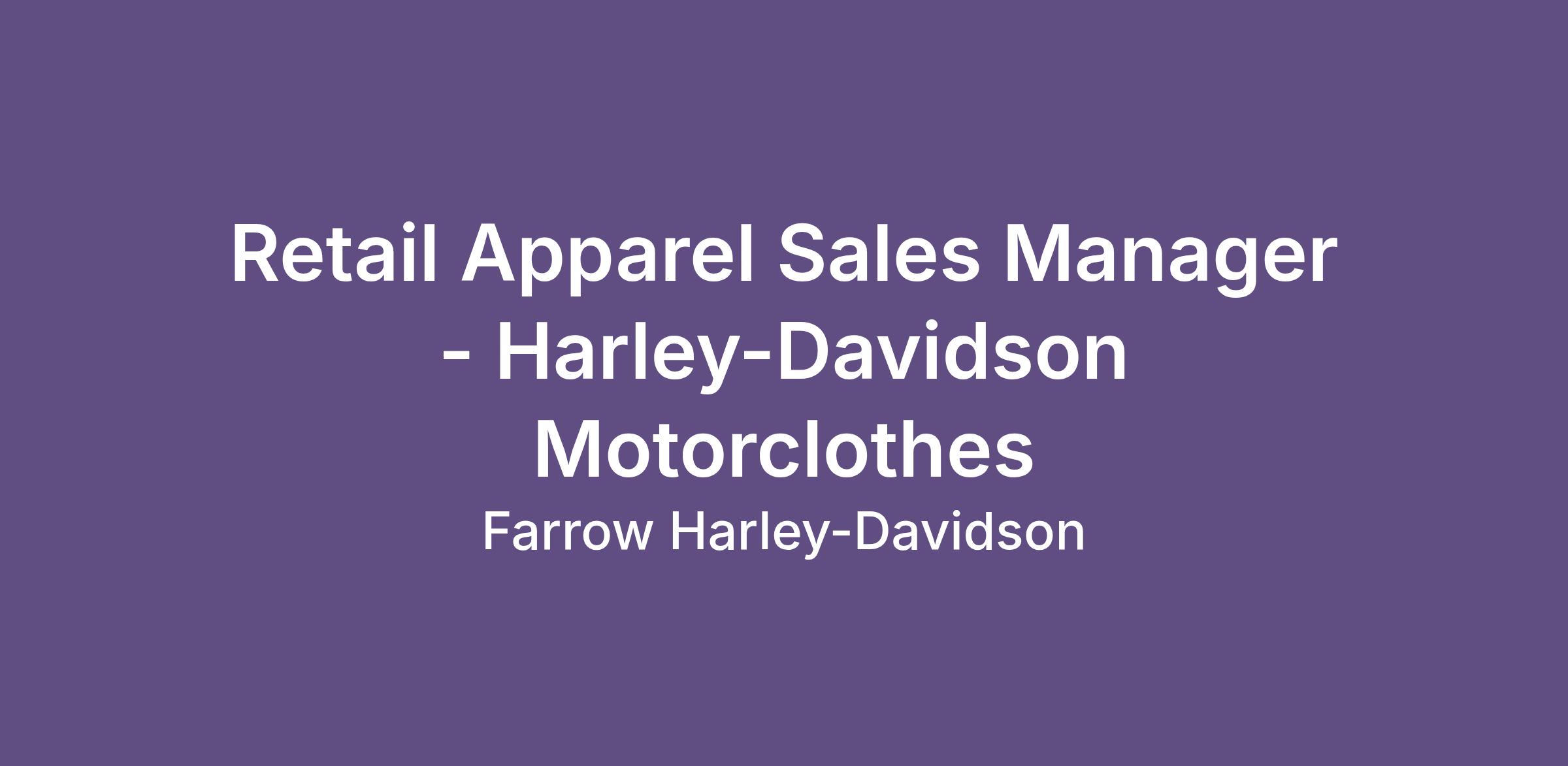 New ownership! Farrow Harley-Davidson is seeking a full-time Retail Sales Manager to increase revenue, train and motivate the sales team in actively selling Harley-Davidson Motorclothes fashion apparel and riding gear, manage the department, and more. Retail sales management experience and Saturday availability is required. Harley-Davidson/Motorcycle knowledge is preferred.