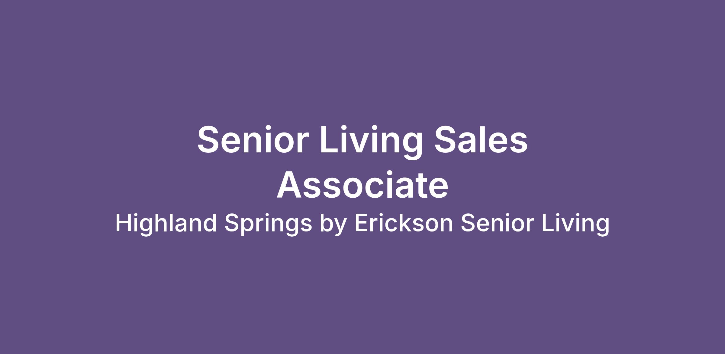 Highland Springs by Erickson Senior LivingJoin our Sales and Marketing team as a Sales Associate, where you'll play a key role both independently and collaboratively. In this position, you'll market the Erickson lifestyle to prospects and analyze business metrics to assess prospect viability and determine the best next steps in the sales and marketing process.