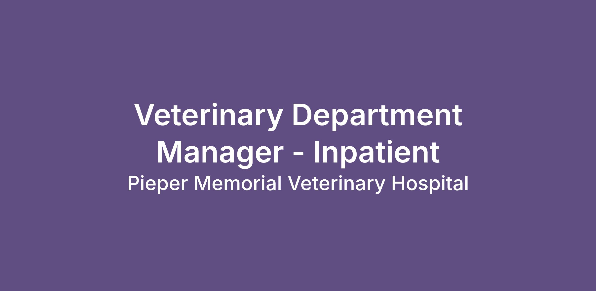 Pieper Memorial Veterinary Center is seeking a dedicated and skilled Department Manager to oversee the day-to-day operations of our Inpatient veterinary team. In this role, you will manage staff, ensure the delivery of exceptional patient care, and provide the resources and support needed for our clients, patients, and the entire Pieper team.